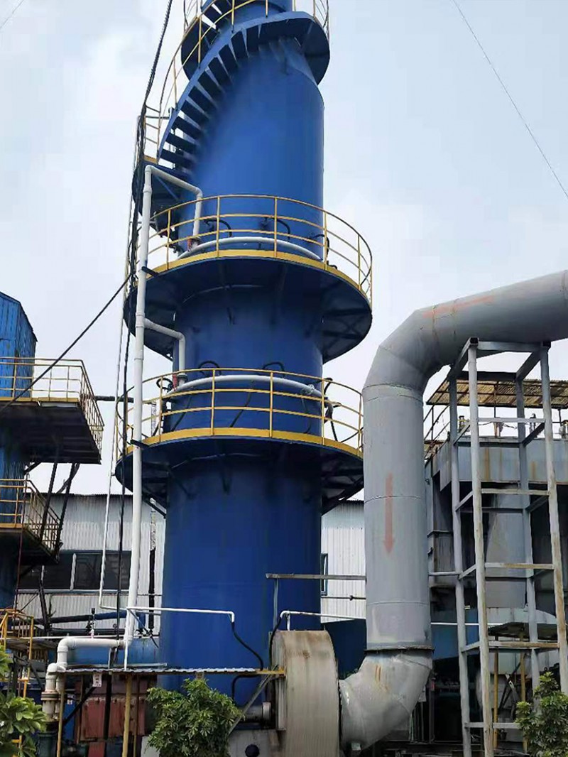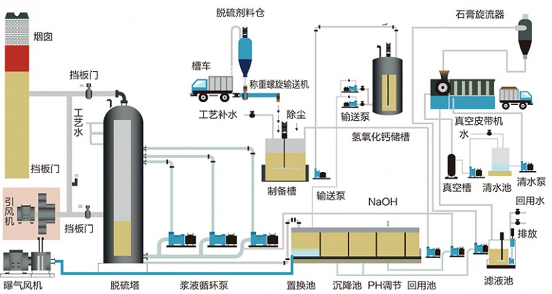 鈉-鈣雙堿法采用火堿吸收SO2  ,石灰還原再生,再生後吸收劑循環使用,無廢水排放。窯爐煙氣經除塵器除塵後進入脫硫塔,並與脫硫液中的堿性脫硫劑在霧化區內充分接觸反應,完成煙氣的脫硫吸收。